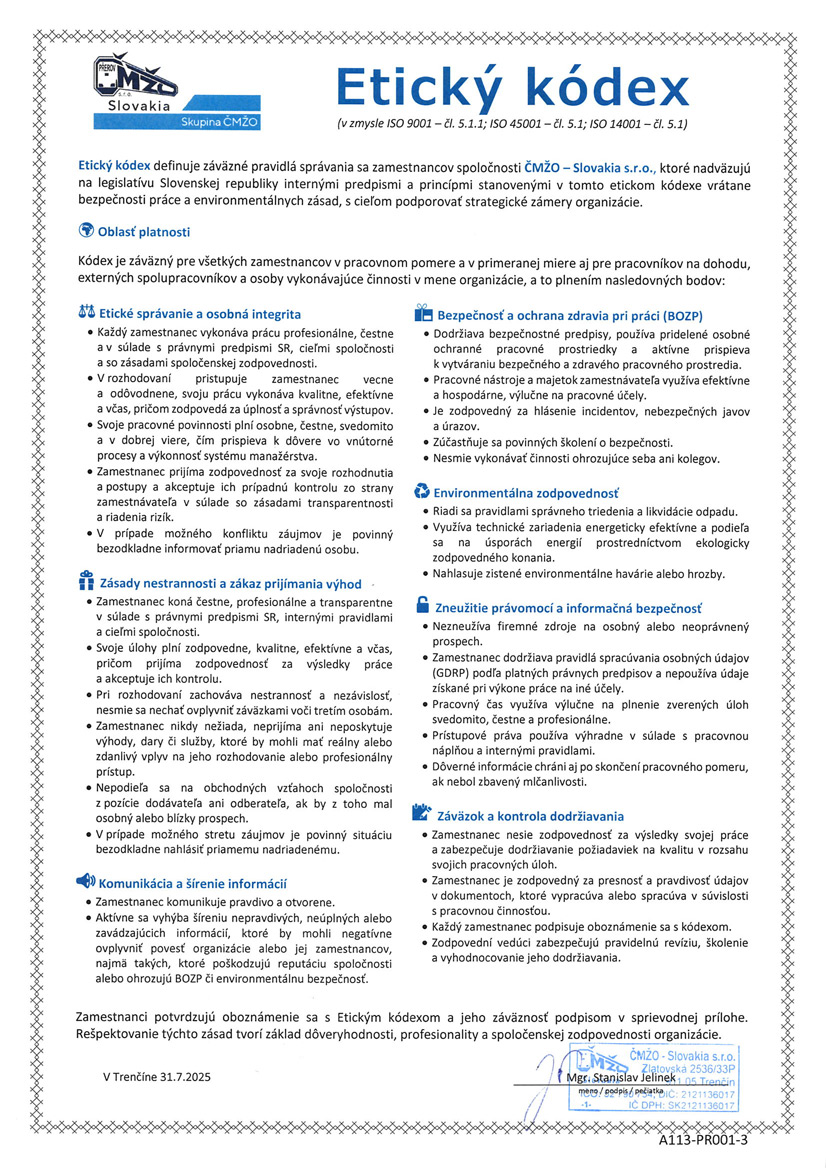 Dodávateľ je povinný okamžite informovať Objednávateľa, ak si je vedomý o skutočných alebo pravdepodobných porušeniach Vyhlásenia Dodávateľa o spoločenskej zodpovednosti a zákaze korupcie v rámci jeho zodpovednosti. Dodávateľ je povinný najmä sa vyhnúť akémukoľvek konaniu, ktorým by mohol poškodiť dobrú povesť obchodného mena ČMŽO alebo ohroziť bezpečnosť dodávok.